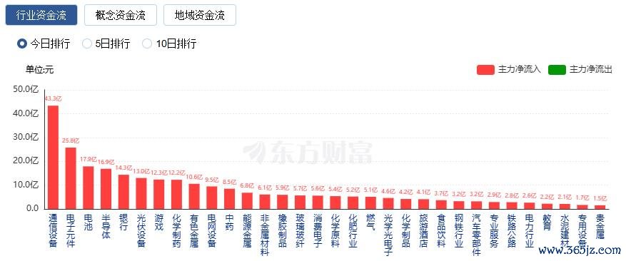 行业资金方面,截至收盘,通信设备、电子元件、电池等净流入排名靠前,其中通信设备净流入43.35亿。