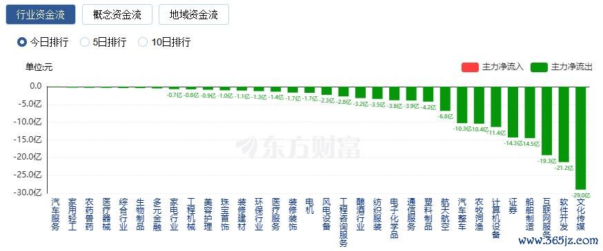 净流出方面,文化传媒、软件开发、互联网服务等净流出排名靠前,其中文化传媒净流出28.99亿元。