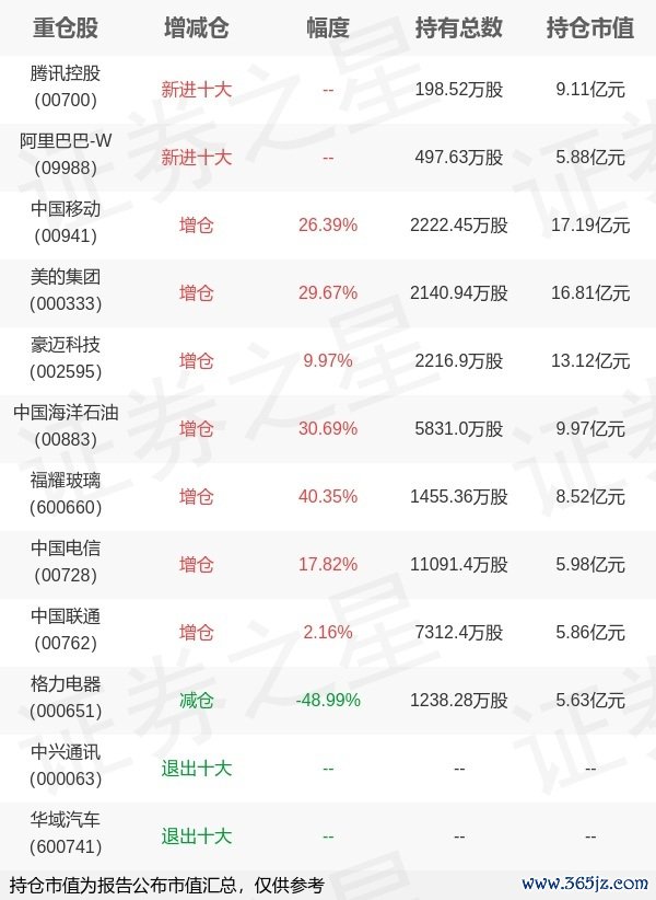 本站消息,4月22日大成基金旗下刘旭管理的大成高鑫股票型基金公布一季报,近1年净值增长率14.03%。与上一季度相比,该基金前十大重仓股新增腾讯控股,阿里巴巴-W;并对中国移动增仓464.1万股,为该基金第一大重仓股;中兴通讯658金融网,华域汽车等退出前十大重仓股;详细数据如下: